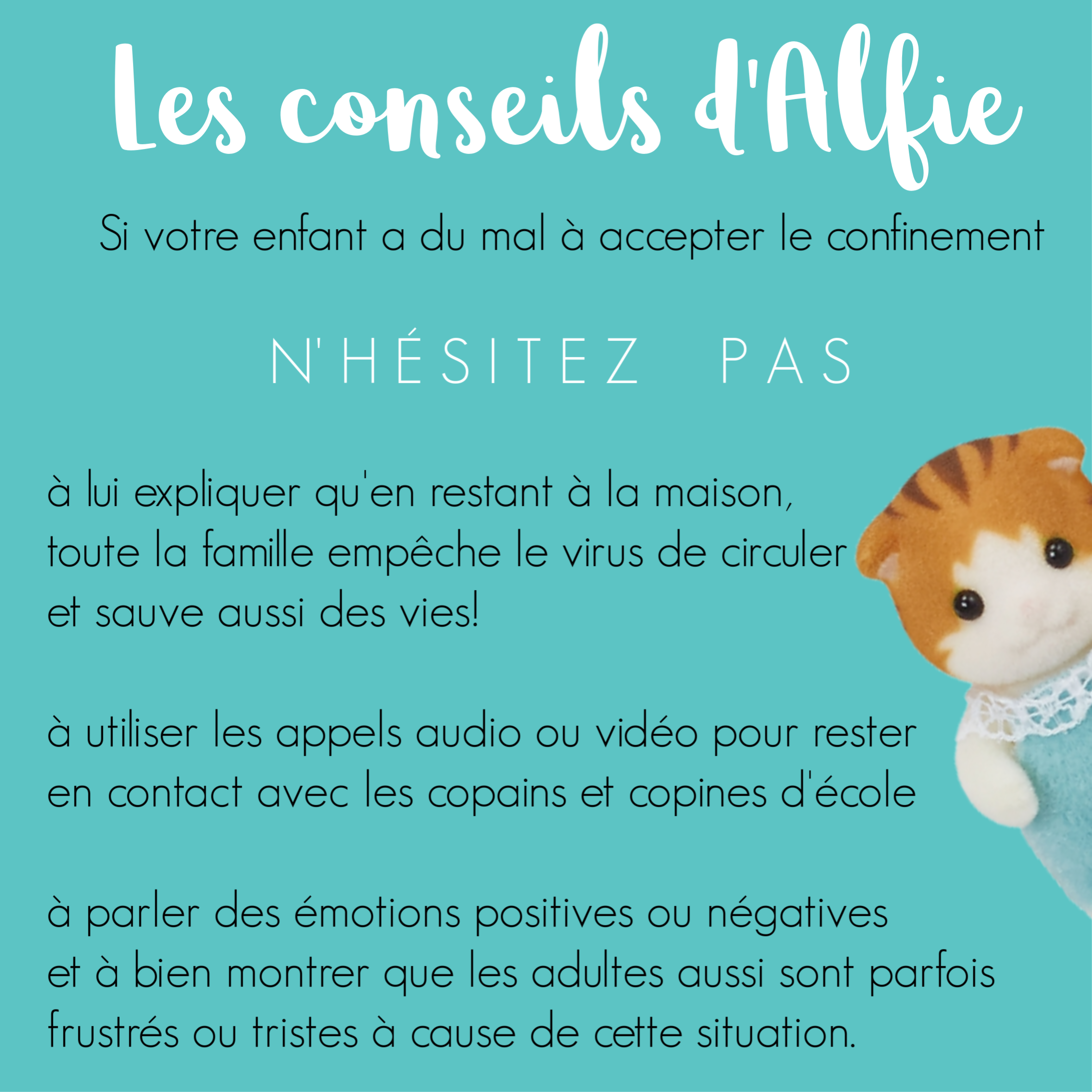 Alfie Maple, l’adorable chaton roux des Sylvanian Families, ne va plus à l’école depuis plusieurs semaines. Même s’il ne comprend pas vraiment pourquoi, il reste à la maison. Comme tous ses petits amis, lui aussi est confiné. Aujourd’hui, il décide d’écrire à sa maîtresse pour lui raconter comment s’organise cette nouvelle vie…
